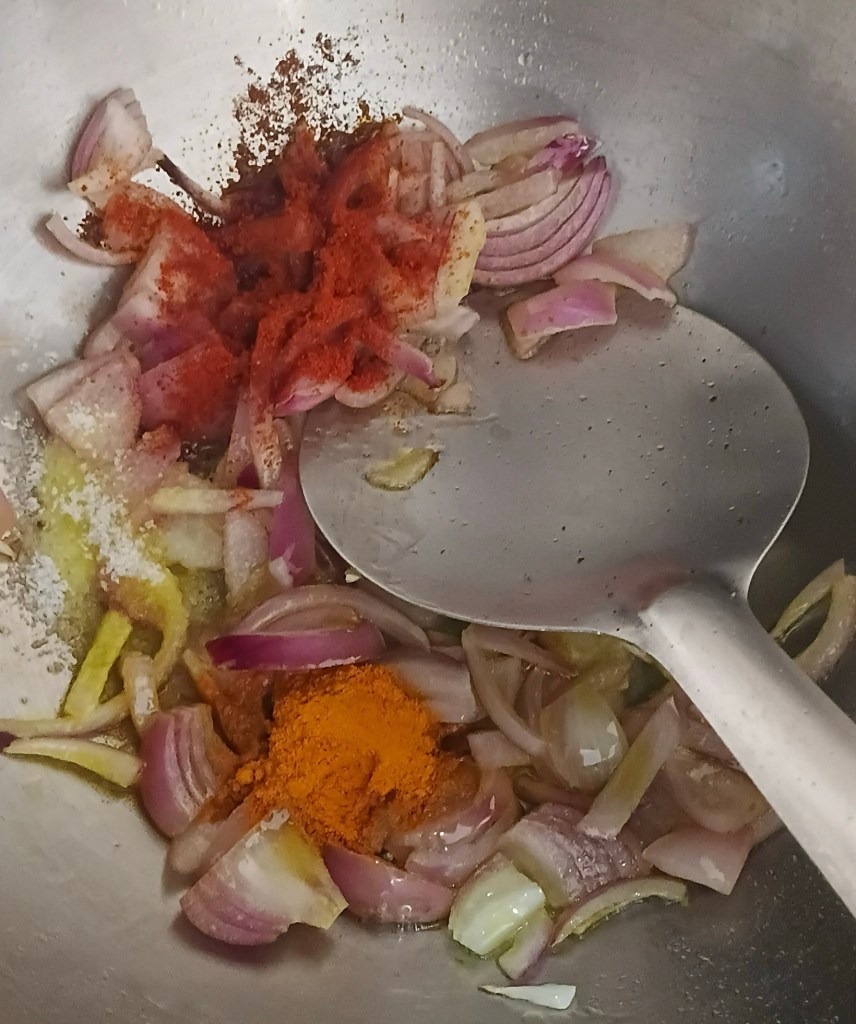 Step 7. Add one tsp Spanish paprika, one tsp salt and one tsp turmeric powder in frying pan.