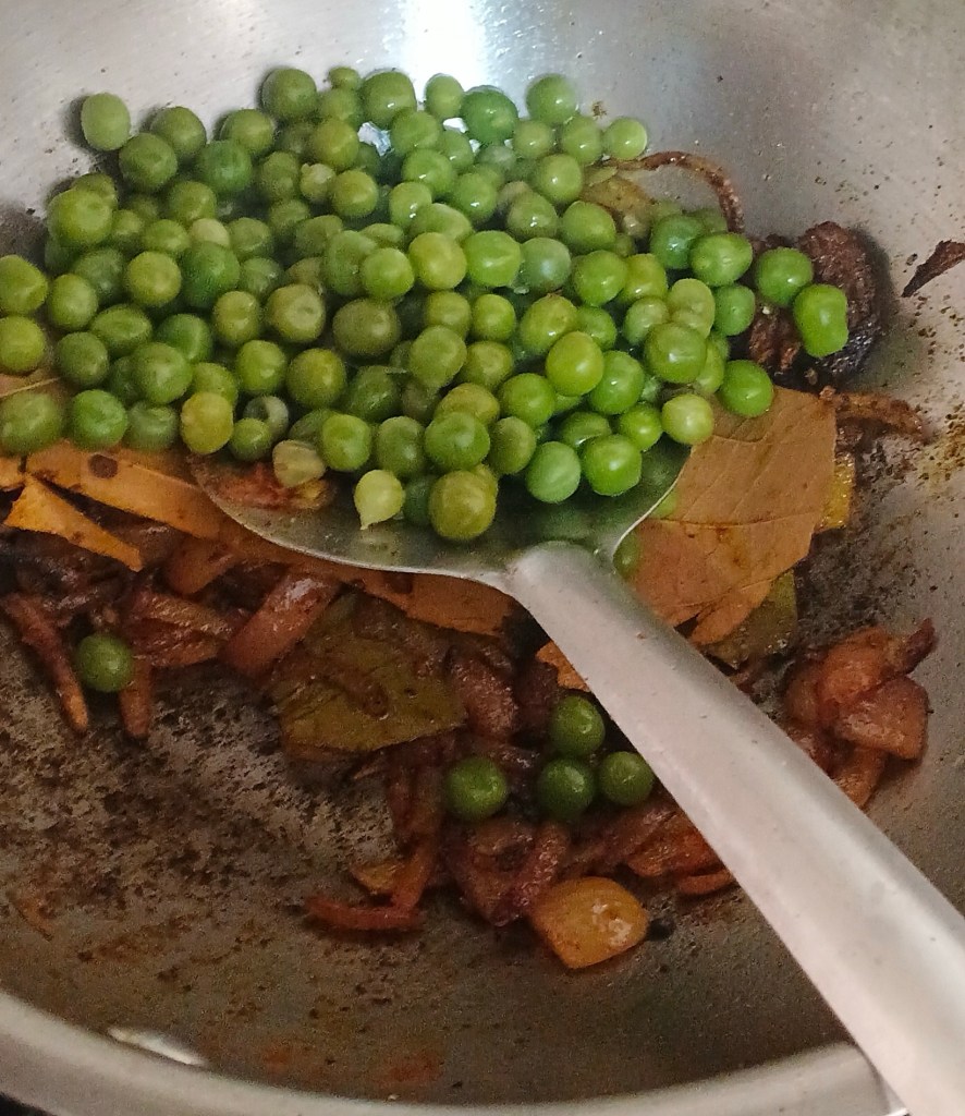 Step 11. Add boiled green peas to frying pan.