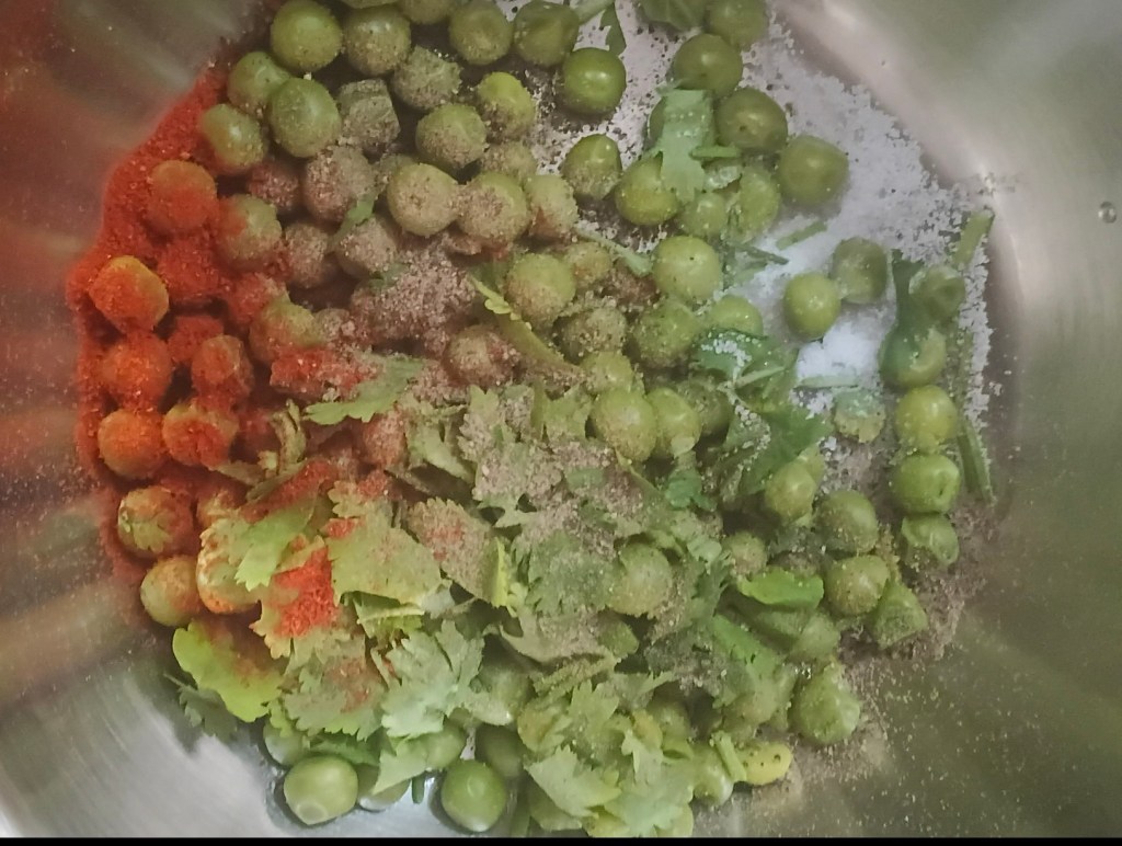 Step 6. Take boiled green peas add Spanish paprika, salt, black pepper and coriander leaves to it, Mix it well. DoNot mash it.
