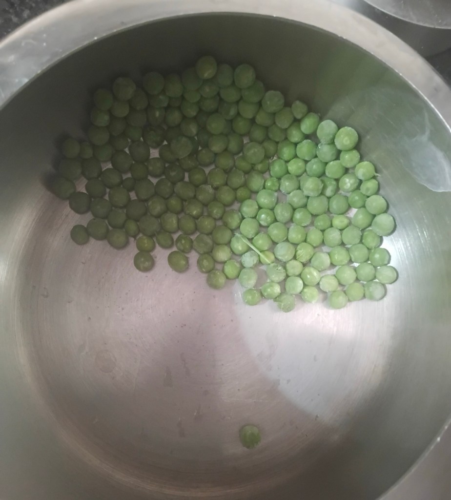 Step 1. Take 3 handfuls of green peas add water to it. Boil it in pressure cooker.