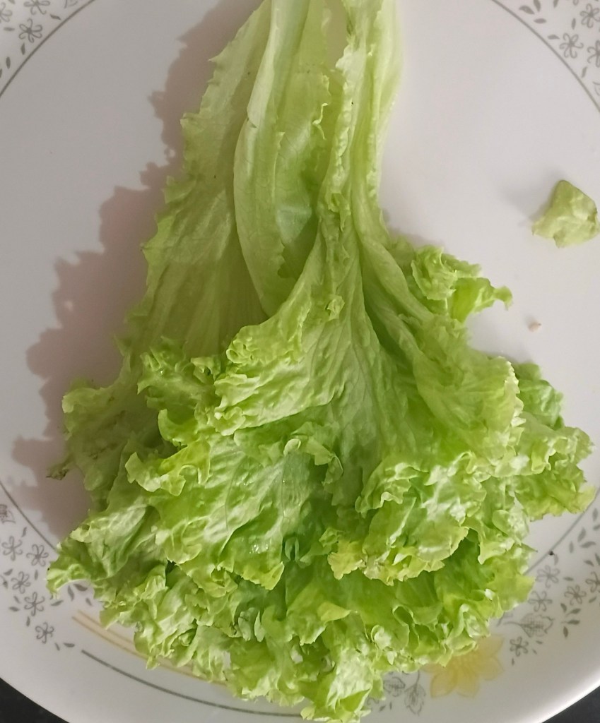 Step 9. Add lettuce, 3 strands with branch cut off, onion and cucumber to burger top now, above folded omelette.