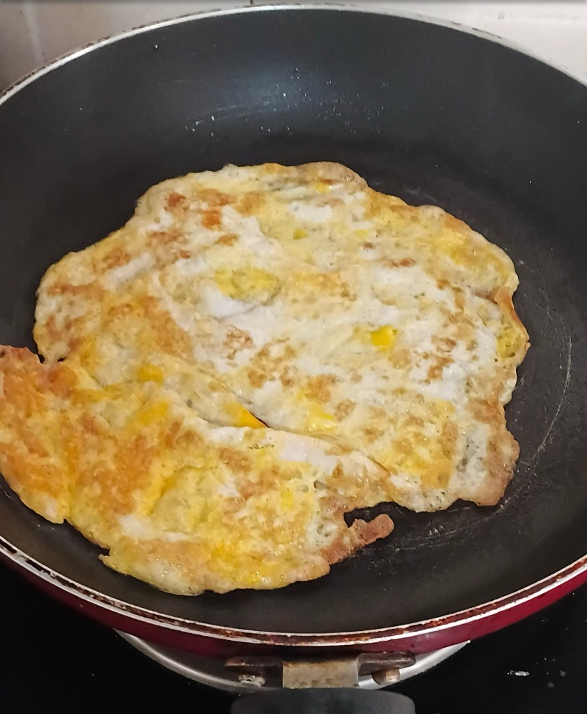 Step 6. Spread beaten egg on pan, make an omelette. Flip side when one side is ready. You can have half fried omelette as well, all depends on your taste.