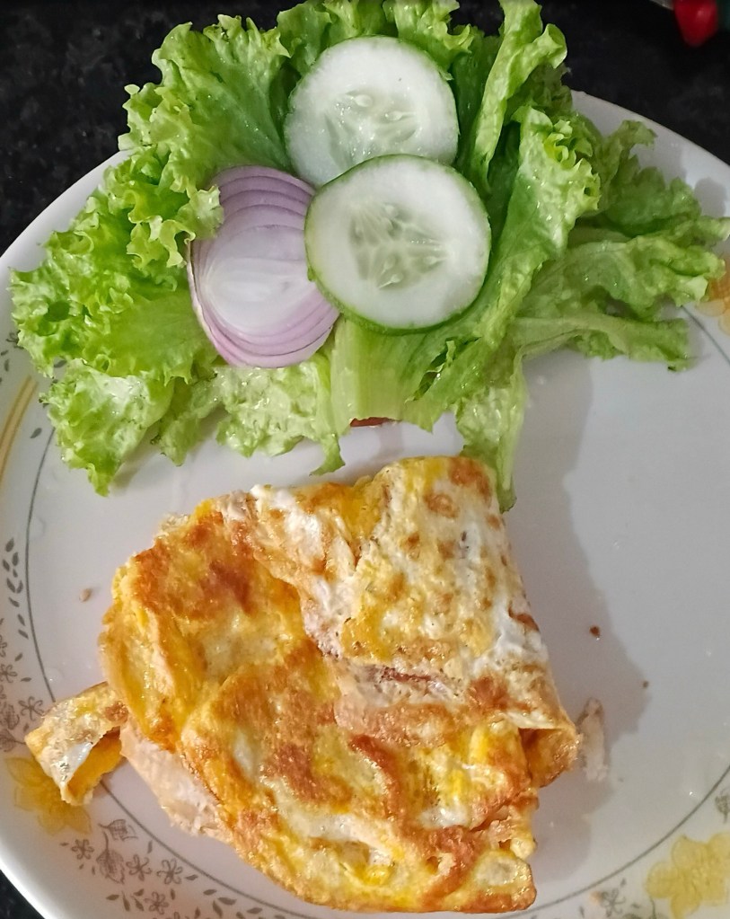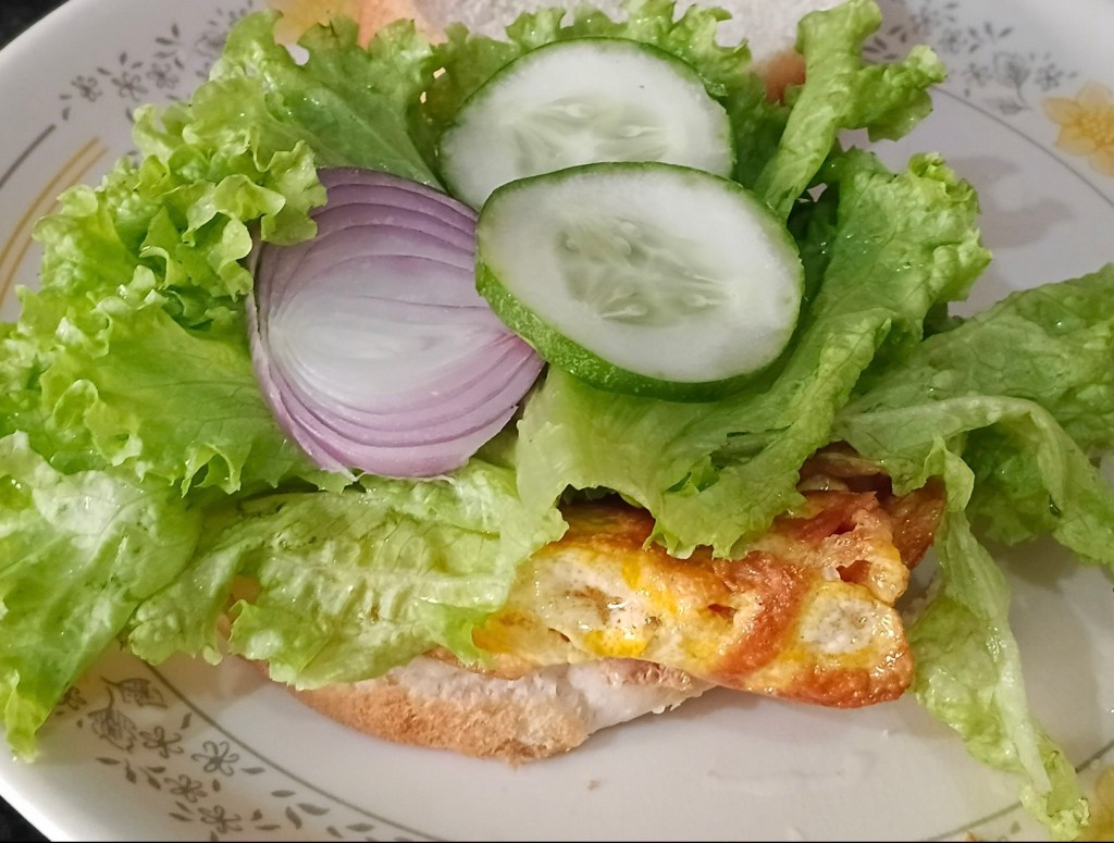 Step 8. Fold two times the omelette and but it in lower part of burger. Keep lettuce, cut onions and two pieces of cut cucumber ready.