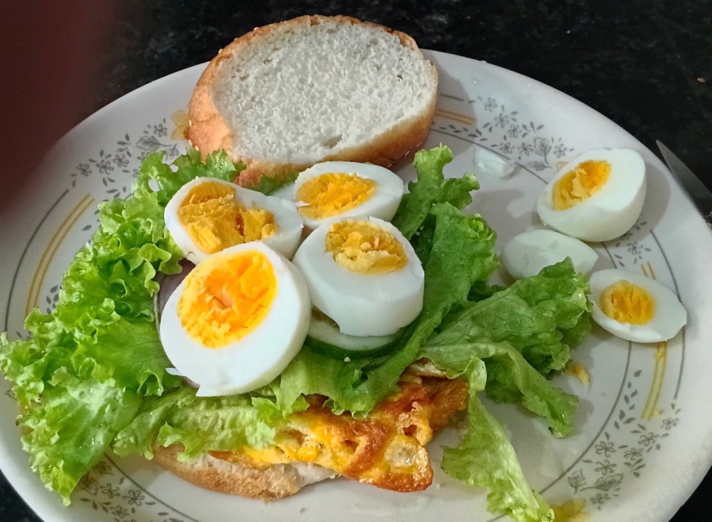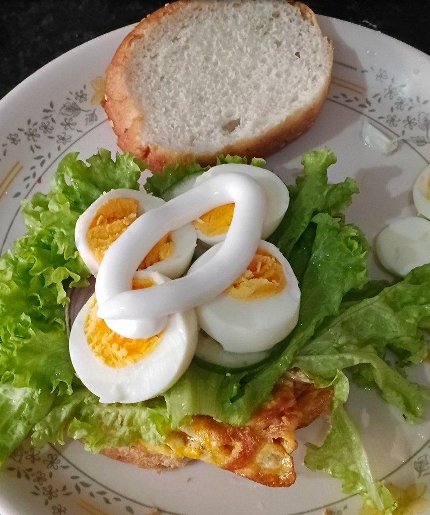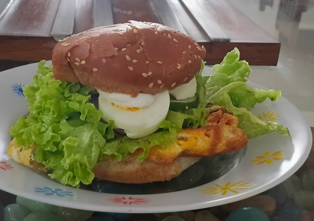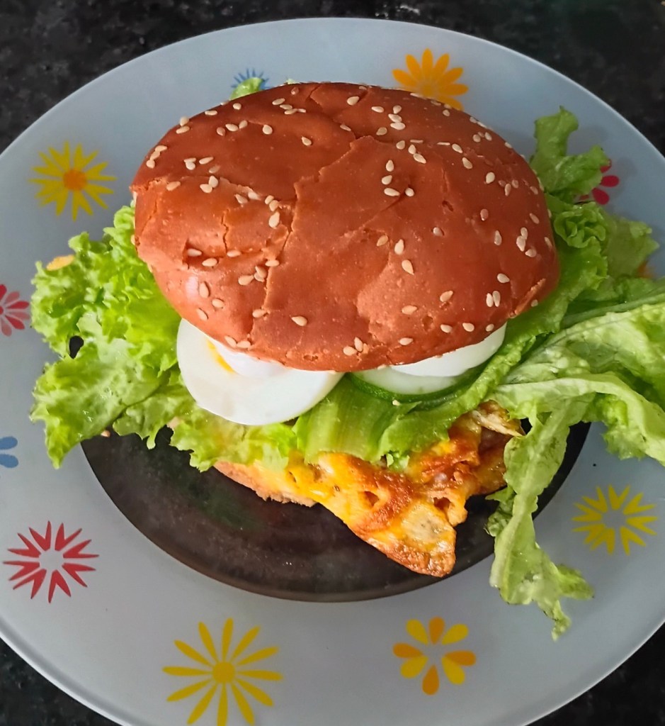 And here is my wonderful burger for today. In short this burger has omelette and 2 boiled eggs with veggies.