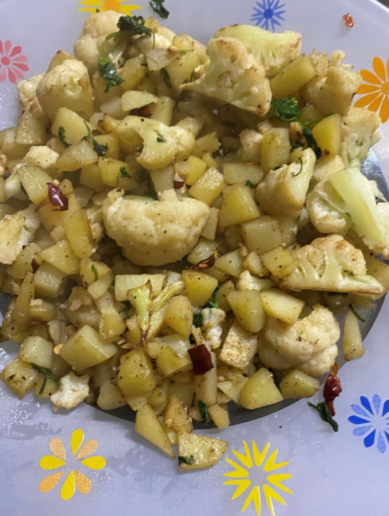 Hot broccoli/cauliflower potato salad – spicy and tasty
